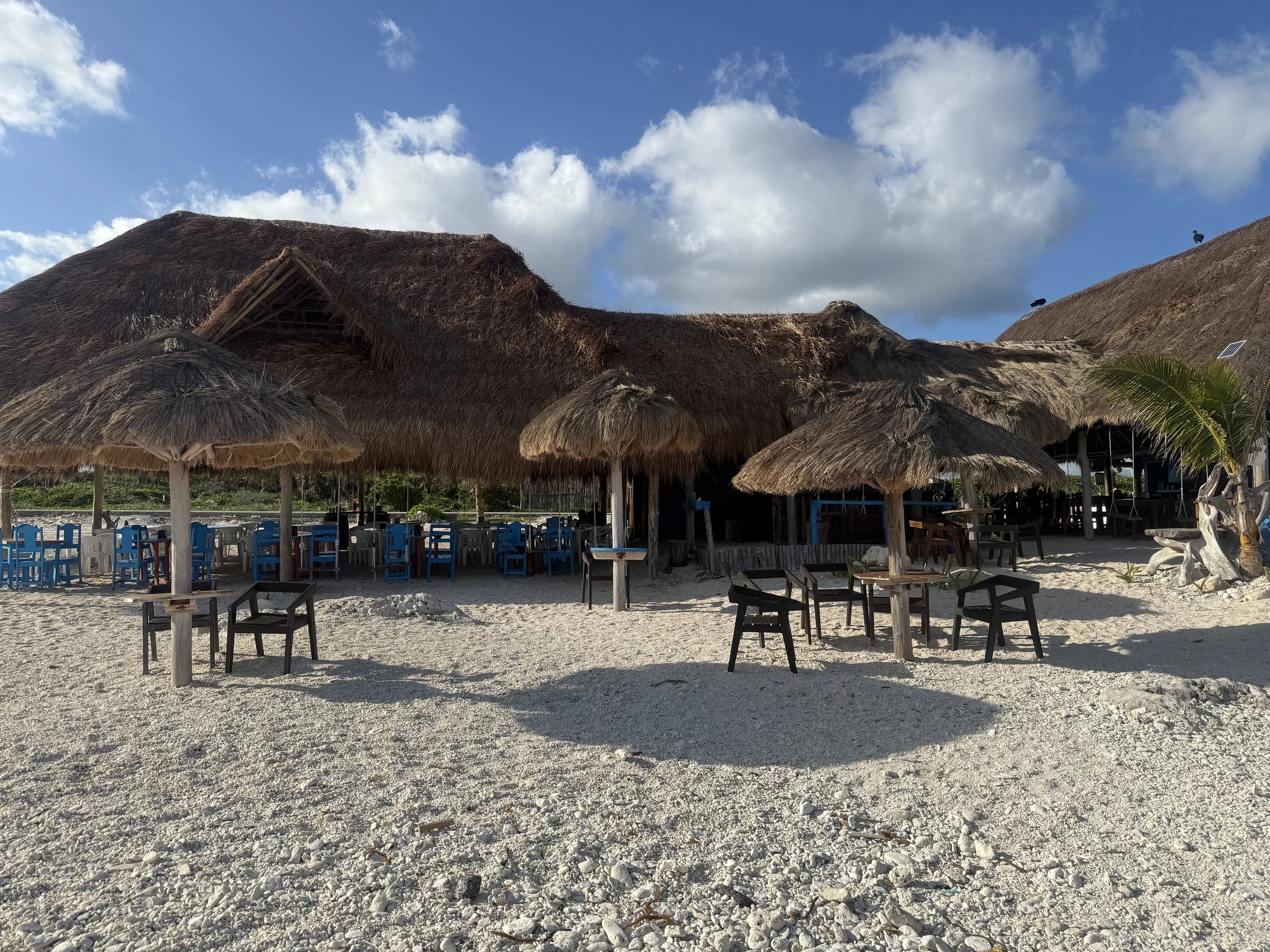 Once again, we headed back to the jeep, and onto our next stop, Playa Chen Rio beach, a serene haven where nature crafted a perfect swimming oasis with its unique rock formations. These natural barriers formed tranquil pools, ideal for a refreshing dip. Being a Sunday, the beach buzzed with the lively energy of local families enjoying their day off. We settled at the Playa Chen Rio Restaurant El Pescador Marisqueria & Bar, ordering a drink to savor as we soaked in the vibrant atmosphere and indulged in some people-watching. Our leisurely afternoon took an unexpected turn when a restaurant worker hurried over, alerting us that our jeep was rolling away. David dashed to the parking lot, only to discover, with relief, that it was another vehicle causing the commotion. Before leaving, we admired a crocodile lounging in the nearby swamp, a reminder of Cozumel's wild heart, before continuing to the famed Coconut’s Bar & Grill.